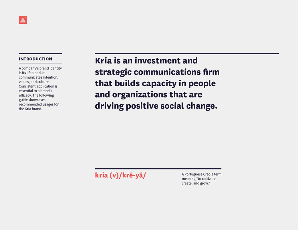 Kria was in its nascent stages when it approached Oxbow for brand strategy, development, and execution. While Kria's business model had already proven successful, the company needed to more clearly communicate their values and voice. Through a series of workshops, Oxbow helped to define Kria as an investment and strategic communications firm that builds capacity in people and organizations that are doing good in the world. With a clear vision and loyal customer base, we helped Kria to develop an authentic, clean brand across all media.